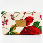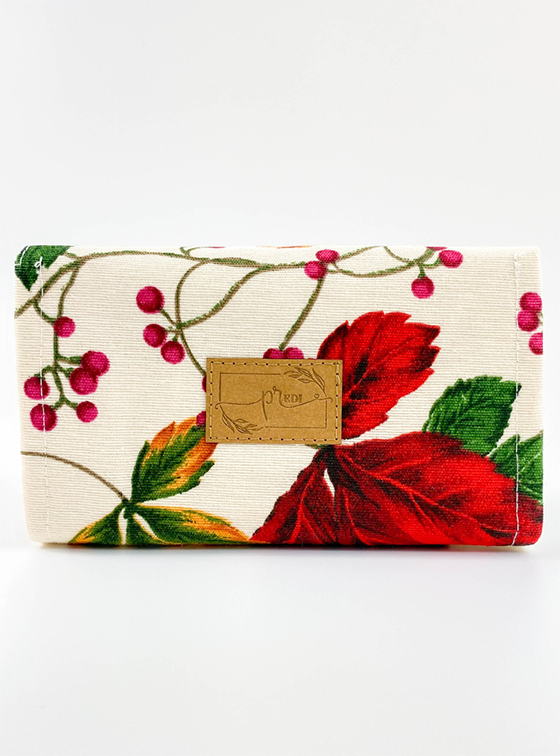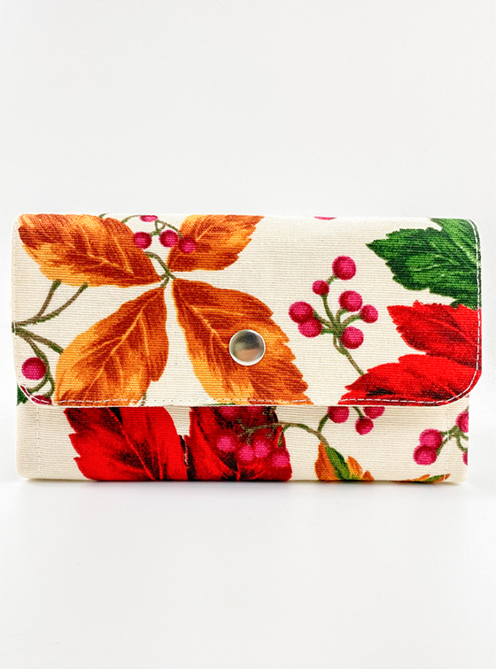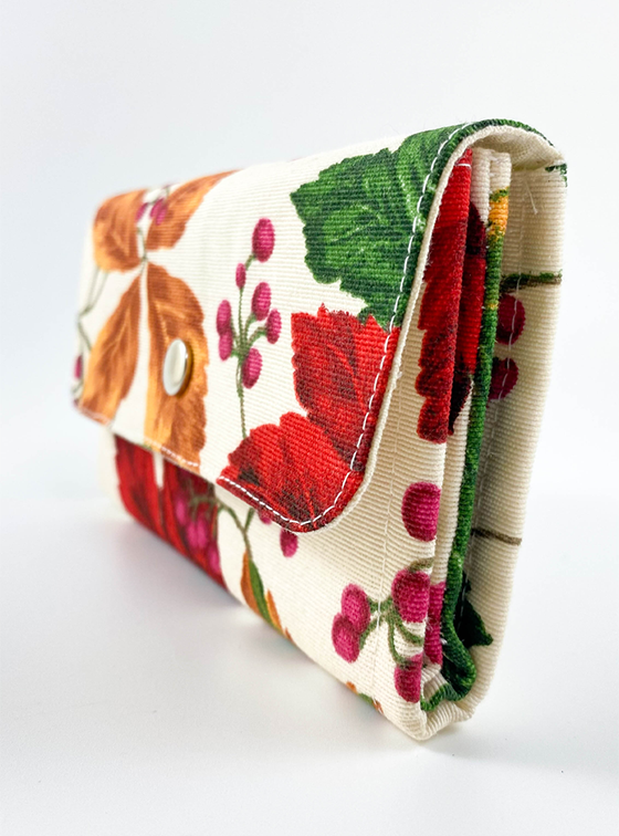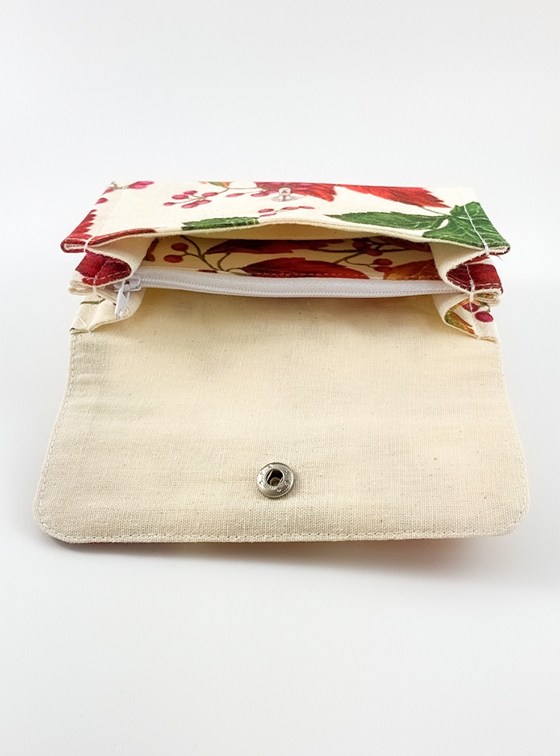 Anyaga dekor- és pamutvászon. Két kártyatartóval és egy cipzáras zsebbel az aprópénz számára.