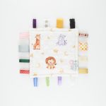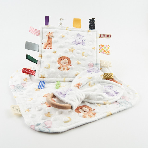 Anyaga pamutvászon és minky, 16db különböző címkével készült.